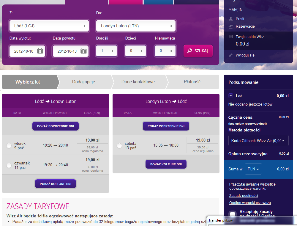 Uwaga: aby niskie ceny były widoczne należy w kolumnie z prawej strony wybrać rodzaj płatności Karta Citibank Wizz Air