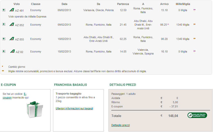 Akurat interesowałby mnie powrot do Walencji (VLC). Jednak jak szukam WAW-AUH-VLC w powyżej podanych terminach, to wyskakuje komunikat, że nie moze znalezc połączenia :( Czy Alitalia w ogóle lata do VLC jako Alitalia/AirOne? Jeśli tak, to w jakie dni trzeba szukać powrotu?
