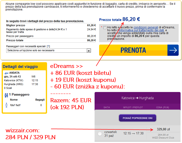 2) z użyciem kuponu eDreams wyjdzie około 192 PLN