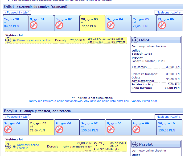 Szukając lotu ze Szczecina/Goleniów do Londynu St. nie ma lotów za 72 złote. Dlaczego kłamiecie. Lot kosztuje 96 złotych