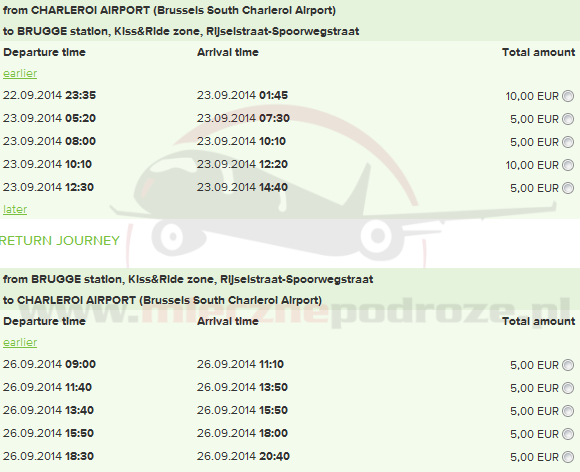 Przykładowa podróż z Warszawy do Brukseli Charleroi jest pokazana poniżej. Z lotniska Charleroi do Brugii dostaniemy się dzięki autobusom Flibco. Za bilety na trasie Lotnisko Bruksela Charleroi — Brugia zapłacimy tylko 5 EUR w każdą stronę! Bilety kupimy na stronie Flibco.com