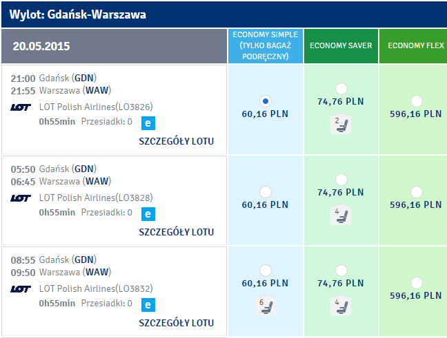 Promocja dotyczy przelotów krajowych, aż do marca 2016. BIlety można kupić na stronie lot.com Najniższa cena dotyczy lotów w taryfie LOT Economy Simple, czyli z samym bagażem podręcznym. Pamiętajcie, iż w wielu przypadkach taryfa z bagażem rejestrowanym w cenie (czyli LOT Economy Classic) jest tylko o kilkanaście złotych droższa niż wersje z samym podręcznym.