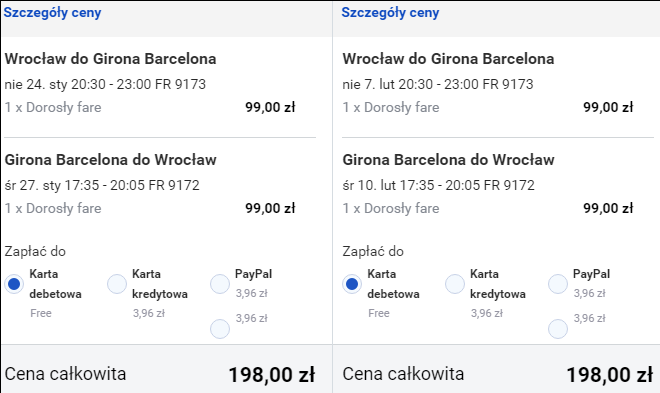 W Ryanair podana cena dotyczy płatności kartą kartą debetową oraz podróży tylko z bagażem podręcznym (waga do 10 kg, wymiary 55x40x20cm) oraz drugą małą sztukę o wymiarach do 35x20x20 cm (więcej informacji: tutaj oraz tutaj). Płatność kartą kredytową lub poprzez PayPal obciążona jest dopłatą w wysokości 2% ceny biletu. Bilety kupujemy na stronie przewoźnika: ryanair.com