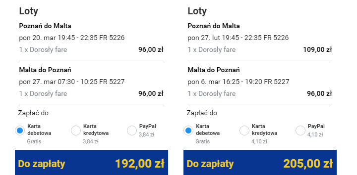 W Ryanair podana cena dotyczy płatności kartą kartą debetową oraz podróży tylko z bagażem podręcznym (waga do 10 kg, wymiary 55x40x20cm) oraz drugą małą sztukę o wymiarach do 35x20x20 cm (więcej informacji: tutaj oraz tutaj). Płatność kartą kredytową lub poprzez PayPal obciążona jest dopłatą w wysokości 2% ceny biletu. Bilety kupujemy na stronie przewoźnika: ryanair.com