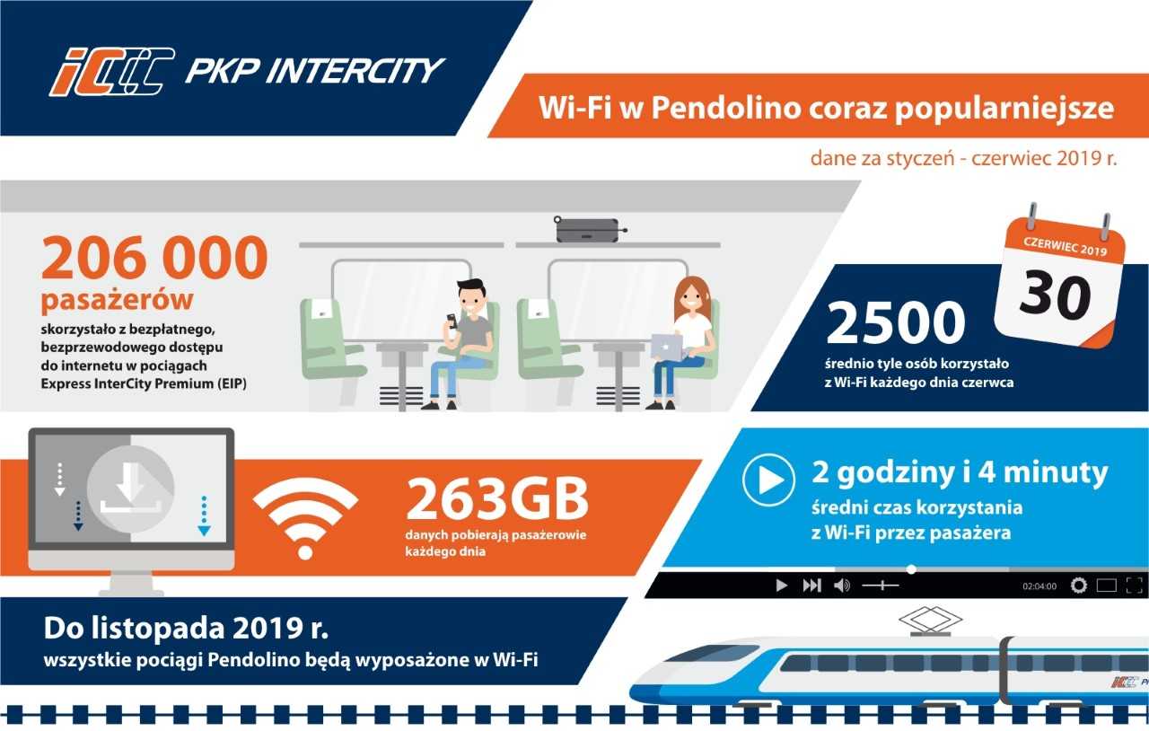 Do końca czerwca 2019 roku, czyli w ciągu pierwszego półrocza funkcjonowania usługi bezpłatnego, bezprzewodowego dostępu do internetu w pociągach Express InterCity Premium (EIP) z usługi skorzystało 206 tysięcy podróżnych. W samym czerwcu było to około 2500 osób dziennie. Średni czas korzystania z Wi-Fi wynosi 2 godziny i 4 minuty. Każdego dnia pasażerowie pobierają średnio 263 GB danych.