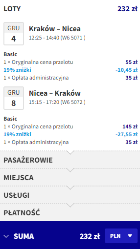 Promocja obowiązuje 19 maja 2023 r. od godziny 00:00 do godziny 23:59 czasu środkowoeuropejskiego letniego (?Okres promocyjny?). Zniżka w wysokości maks. 19% dotyczy ceny biletów, ale nie obejmuje opłaty administracyjnej. Zniżka w wysokości maks. 19% dotyczy wszystkich lotów dostępnych na stronie wizzair.com oraz w aplikacji mobilnej WIZZ w okresie promocyjnym. Okres podróży jest nieograniczony. Cena dotyczy wyłącznie rezerwacji dokonanych na stronie wizzair.com lub w aplikacji mobilnej Wizz Air. Promocja nie dotyczy rezerwacji grupowych.