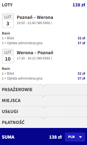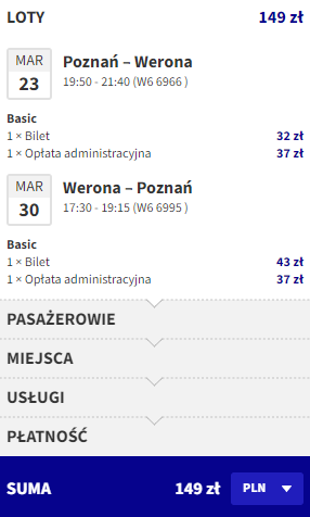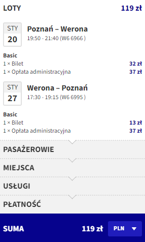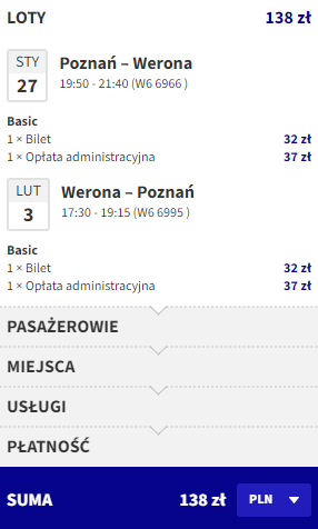 Najniższą cenę uzyskają osoby, które są członkami Wizz Discount Club. Osoby bez członkostwa zapłacą więcej. Sposób płatności (karta czy Konto Wizz) nie ma wpływu na cenę końcową. Podana cena dotyczy podróży z Bagażem Podręcznym. Bilety kupujemy na stronie wizzair.com
