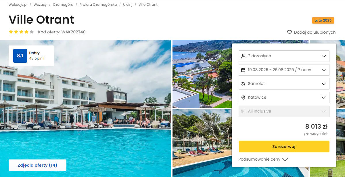 Współpracujemy z serwisem wakacje.pl i dzięki temu mogliśmy zaprezentować w/w ofertę. Treści pochodzą z serwisu wakacje.pl. Stanowią własność prawnie chronioną należącą do Wakacje.pl S.A. i/lub jej partnerów
