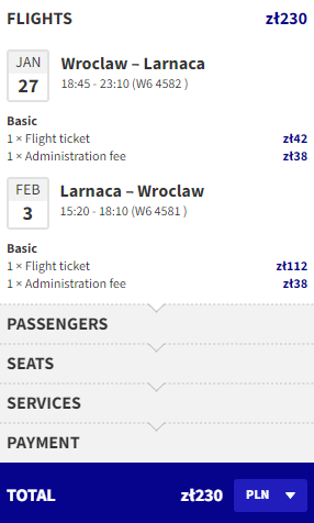Najniższą cenę uzyskają osoby, które są członkami Wizz Discount Club. Osoby bez członkostwa zapłacą więcej. Sposób płatności (karta czy Konto Wizz) nie ma wpływu na cenę końcową. Podana cena dotyczy podróży z Bagażem Podręcznym. Bilety kupujemy na stronie wizzair.com