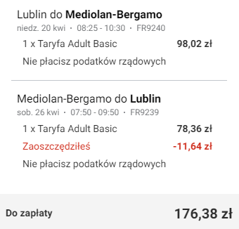 Lublin (LUZ) – Mediolan Bergamo od ~136,37 PLN RT: