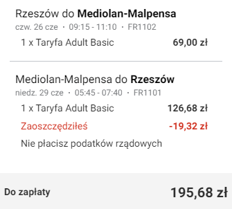 Rzeszów (RZE) – Mediolan Malpensa (MXP) od ~138 PLN* RT: