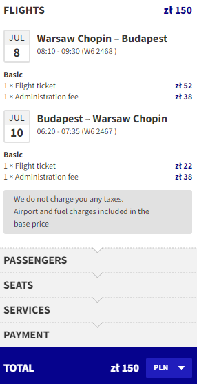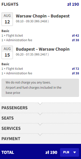 Najniższą cenę uzyskają osoby, które są członkami Wizz Discount Club. Osoby bez członkostwa zapłacą więcej. Sposób płatności (karta czy Konto Wizz) nie ma wpływu na cenę końcową. Podana cena dotyczy podróży z Bagażem Podręcznym. Bilety kupujemy na stronie wizzair.com