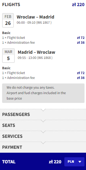 Najniższą cenę uzyskają osoby, które są członkami Wizz Discount Club. Osoby bez członkostwa zapłacą więcej. Sposób płatności (karta czy Konto Wizz) nie ma wpływu na cenę końcową. Podana cena dotyczy podróży z Bagażem Podręcznym. Bilety kupujemy na stronie wizzair.com