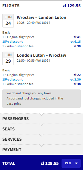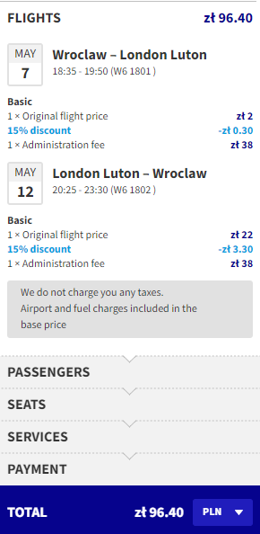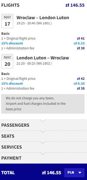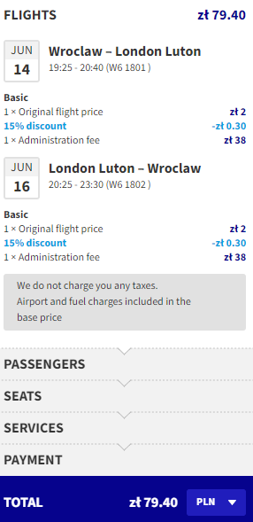 Najniższą cenę uzyskają osoby, które są członkami Wizz Discount Club. Osoby bez członkostwa zapłacą więcej. Sposób płatności (karta czy Konto Wizz) nie ma wpływu na cenę końcową. Podana cena dotyczy podróży z Bagażem Podręcznym. Bilety kupujemy na stronie wizzair.com