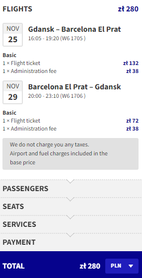Najniższą cenę uzyskają osoby, które są członkami Wizz Discount Club. Osoby bez członkostwa zapłacą więcej. Sposób płatności (karta czy Konto Wizz) nie ma wpływu na cenę końcową. Podana cena dotyczy podróży z Bagażem Podręcznym. Bilety kupujemy na stronie wizzair.com