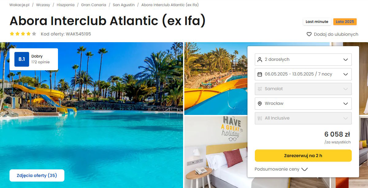 Współpracujemy z serwisem wakacje.pl i dzięki temu mogliśmy zaprezentować w/w ofertę. Treści pochodzą z serwisu wakacje.pl. Stanowią własność prawnie chronioną należącą do Wakacje.pl S.A. i/lub jej partnerów