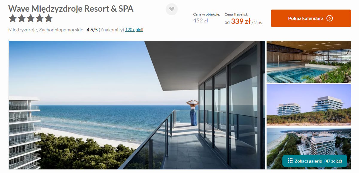 Jeden z najbardziej oryginalnych obiektów, kompleks inspirowany naturą, tuż przy plaży – śniadania lub 2 posiłki, dostęp do basenów, saun, jacuzzi oraz atrakcje dla dzieci w cenie od 339 PLN/doba