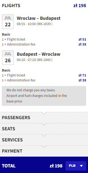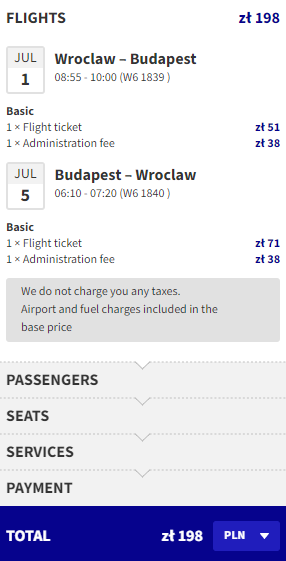 Najniższą cenę uzyskają osoby, które są członkami Wizz Discount Club. Osoby bez członkostwa zapłacą więcej. Sposób płatności (karta czy Konto Wizz) nie ma wpływu na cenę końcową. Podana cena dotyczy podróży z Bagażem Podręcznym. Bilety kupujemy na stronie wizzair.com