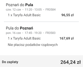 W Ryanair podana cena dotyczy podróży tylko z bagażem podręcznym zgodnie z aktualnymi zasadami jego przewozu. Bilety kupujemy na stronie przewoźnika: ryanair.com
