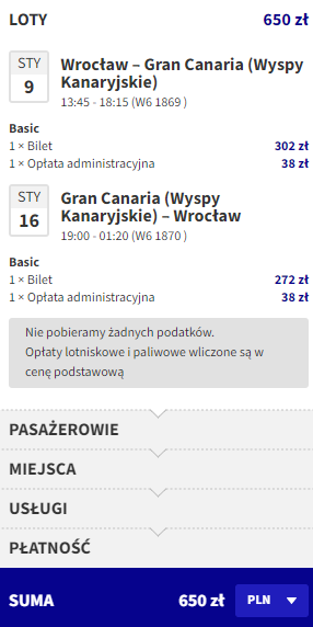 Najniższą cenę uzyskają osoby, które są członkami Wizz Discount Club. Osoby bez członkostwa zapłacą więcej. Sposób płatności (karta czy Konto Wizz) nie ma wpływu na cenę końcową. Podana cena dotyczy podróży z Bagażem Podręcznym. Bilety kupujemy na stronie wizzair.com