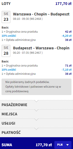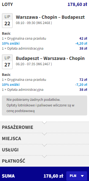 Najniższą cenę uzyskają osoby, które są członkami Wizz Discount Club. Osoby bez członkostwa zapłacą więcej. Sposób płatności (karta czy Konto Wizz) nie ma wpływu na cenę końcową. Podana cena dotyczy podróży z Bagażem Podręcznym. Bilety kupujemy na stronie wizzair.com