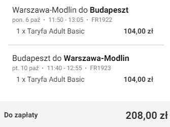 Warszawa Modlin (WMI) – Budapeszt (BUD) od ~207 PLN RT