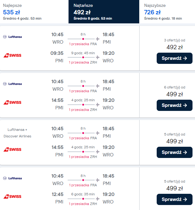 Jest dobra cena lotów do Hiszpanii – na Majorkę. Lecimy liniami z Grupy Lufthansa – z Wrocławia. W cenie mamy przelot z bagażem podręcznym, ale jest też dostępna taryfa z bagażem rejestrownaym.