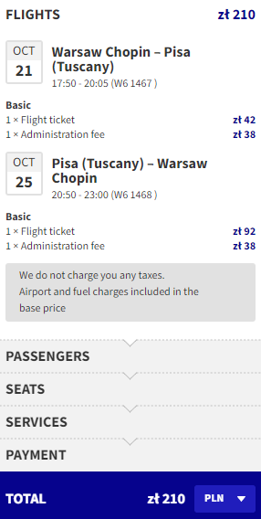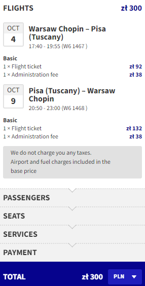 Najniższą cenę uzyskają osoby, które są członkami Wizz Discount Club. Osoby bez członkostwa zapłacą więcej. Sposób płatności (karta czy Konto Wizz) nie ma wpływu na cenę końcową. Podana cena dotyczy podróży z Bagażem Podręcznym. Bilety kupujemy na stronie wizzair.com