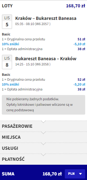 Najniższą cenę uzyskają osoby, które są członkami Wizz Discount Club. Osoby bez członkostwa zapłacą więcej. Sposób płatności (karta czy Konto Wizz) nie ma wpływu na cenę końcową. Podana cena dotyczy podróży z Bagażem Podręcznym. Bilety kupujemy na stronie wizzair.com