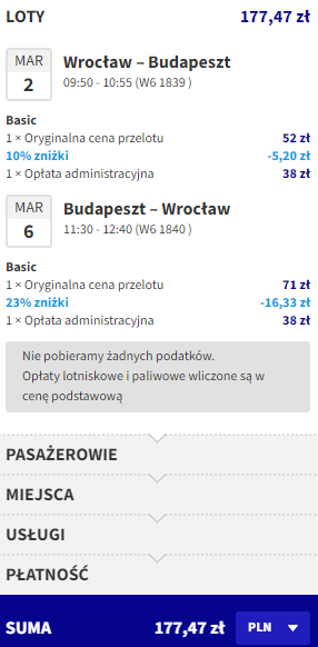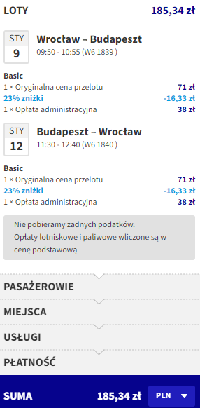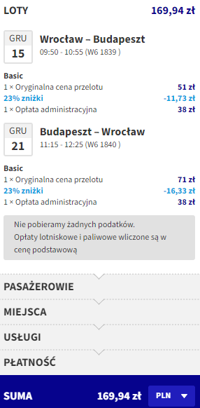 Najniższą cenę uzyskają osoby, które są członkami Wizz Discount Club. Osoby bez członkostwa zapłacą więcej. Sposób płatności (karta czy Konto Wizz) nie ma wpływu na cenę końcową. Podana cena dotyczy podróży z Bagażem Podręcznym. Bilety kupujemy na stronie wizzair.com