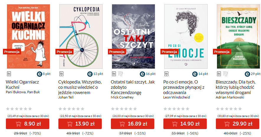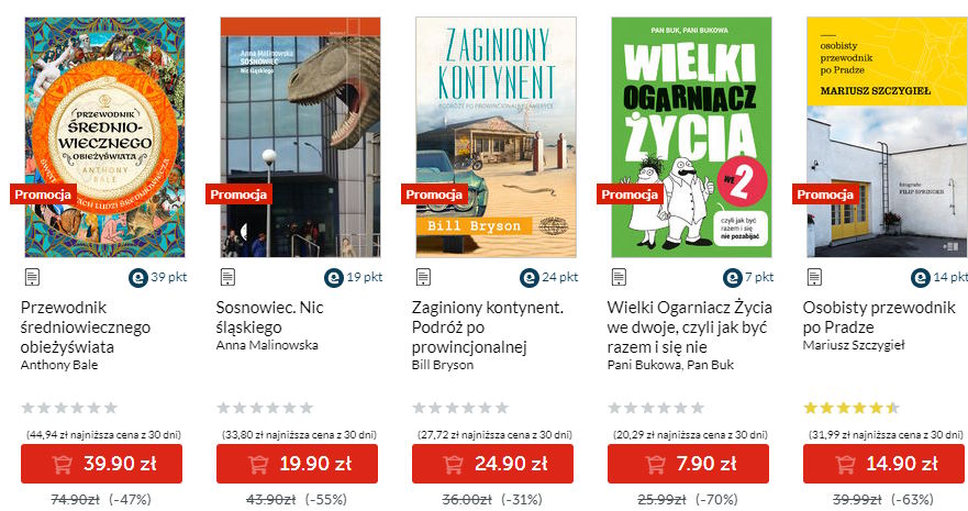 W najbardziej nas interesującej kategorii “Przewodniki i podróże” znajdziemy prawie kilkaset pozycji w obniżonej cenie, w tym także ulubione przez Was Travelbooki!