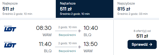 Bilety na połączenia z Warszawy do Bolonii dostępne są we wszystkich kanałach sprzedaży, w tym na stronie lot.com, w LOT Contact Center i w biurach LOT Travel.