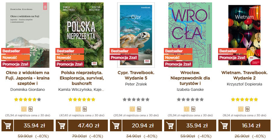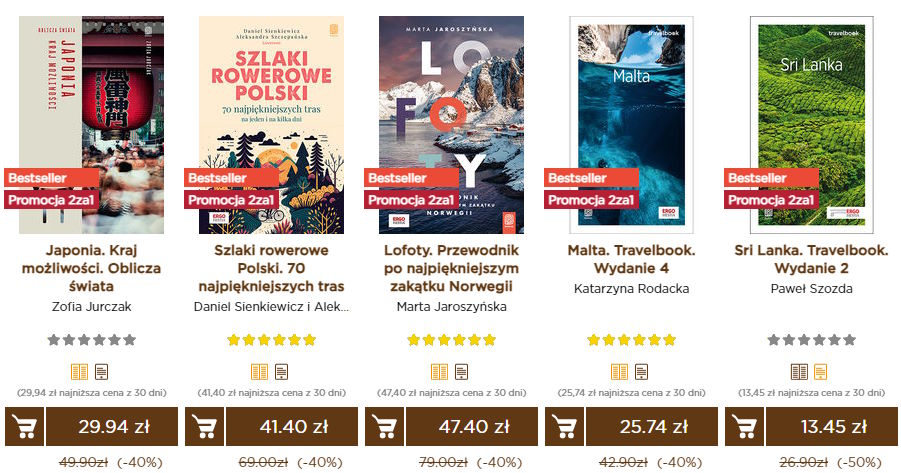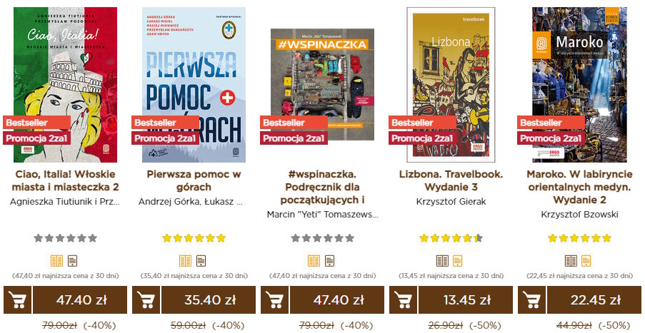 Trwa kilka promocji na przewodniki. Na początek mamy promocję 2za1 – dwa przewodniki w cenie jednego. Dodatkowo możemy uzyskać do 50% rabatu na wybrane książki i przewodniki (przy zakupie pojedynczych sztuk).