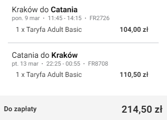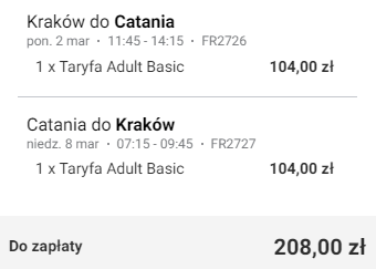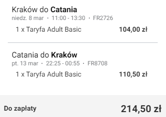 Kraków (KRK) – Katania (CTA) od ~208 PLN RT