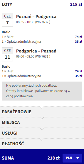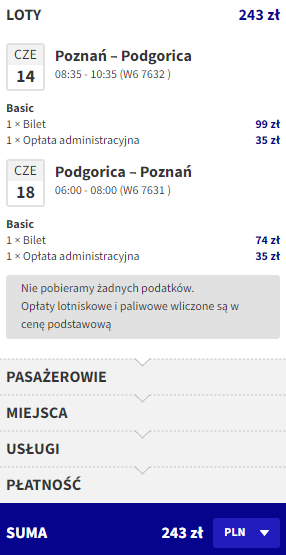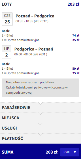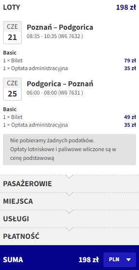 Najniższą cenę uzyskają osoby, które są członkami Wizz Discount Club. Osoby bez członkostwa zapłacą więcej. Sposób płatności (karta czy Konto Wizz) nie ma wpływu na cenę końcową. Podana cena dotyczy podróży z Bagażem Podręcznym. Bilety kupujemy na stronie wizzair.com